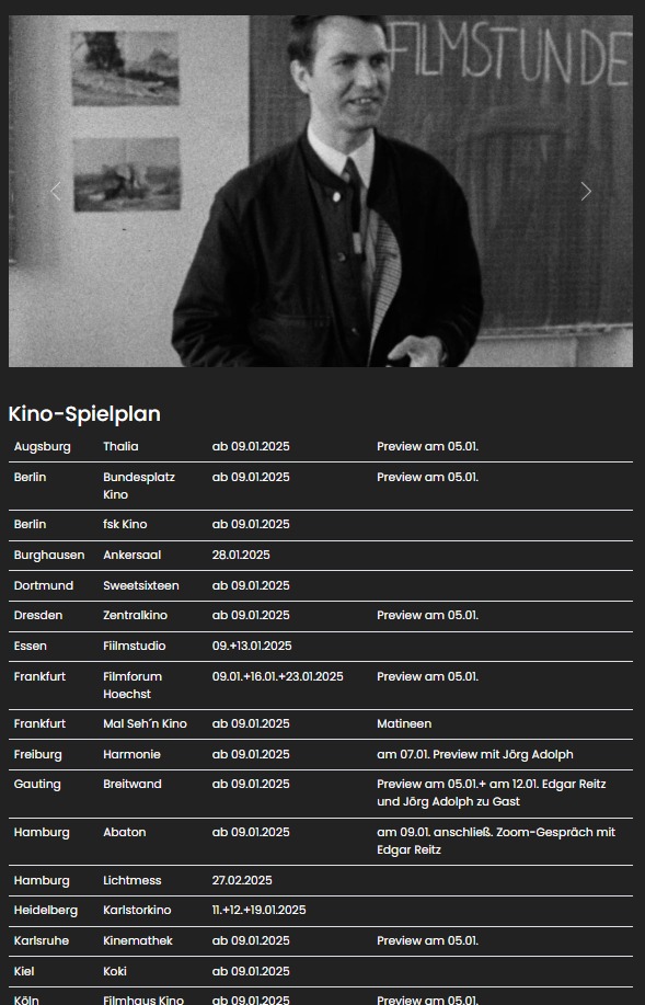 Dabei wird deutlich, dass am Montag, 6.1., in München zwei Vorpremieren mit Edgar Reitz und Jörg Adolph stattfinden, nämlich um 18 Uhr im Theatiner-Kino und um 20 Uhr im Monopol (die Links führen direkt zum Vorverkauf).