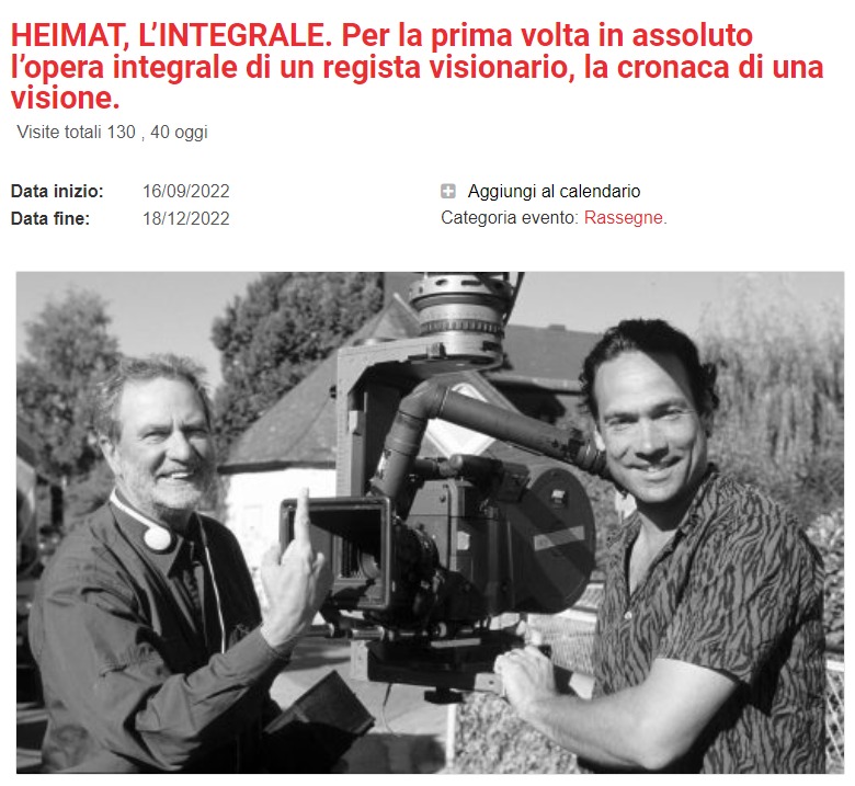 Wieder einmal zeigt sich, wie beliebt die HEIMAT-Chroniken in Italien sind. In Deutschland ist leider kein Kino auf die Idee gekommen, Edgar Reitz in auch nur annähernd ähnlicher Weise zu würdigen. Immerhin dürfen wir uns aber auf die Aufführung der digital restaurierten Zweiten Heimat in verschiedenen Städten freuen, insbesondere voraussichtlich im November in Simmern, der „Heimat der Heimat“.
